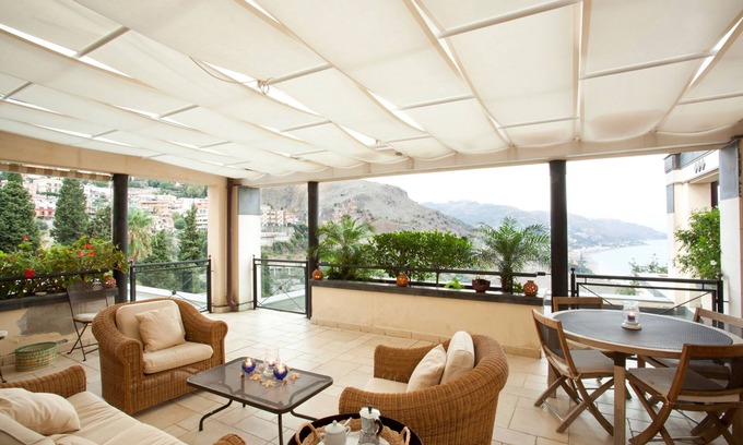 Lovely and luxury apartment in Taormina with a stunning sea view terrace and a shared swimming pool perfect for a refreshing swim after a sunny day passed visiting the archaeological sites or after a full day passed on the beach.