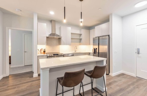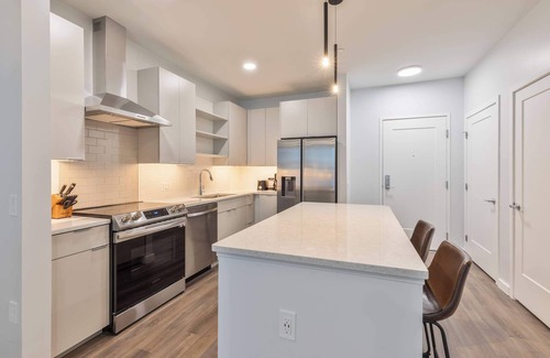 This modern apartment features a gourmet kitchen with stainless steel appliances, a hood range over the stove, and quartz countertops. Enjoy spacious walk-in closets, ample closet storage, a bath/shower combo, and courtyard views.