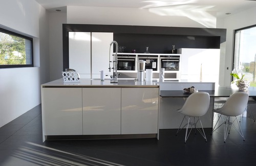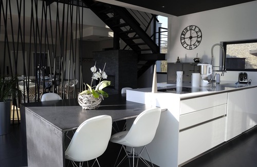 This large living room combines a design and airy living room, a dining area, posed in front of the contemporary fireplace, and a kitchen equipped with high-end appliances.