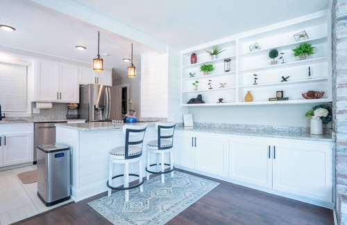 Renovated luxury home featuring 4 bedrooms, 3 full bathrooms, a salt water pool, and more. 2 King-size beds, 1 Queen, and 2 bunks with 4 twin beds. 2 shower/tubs and one shower. Living room features leather sofas. Dining room hosts a table big enough for 10 people. Office room provided with desk. Full kitchen. Outside, enjoy a salt water pool on a 1500 sqft travertine deck, outside seating, outside grill, fire pit, cornhole and jumbo Jenga, as well as a private playground for the kiddos.