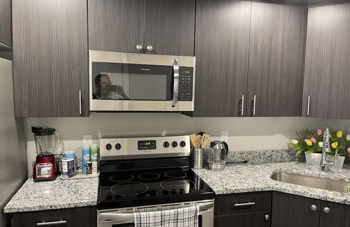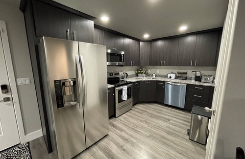 Family friendly, luxury basement apartment consist of TWO spacious Bed room with 2queen beds and one Twin Bed for 5 guests.