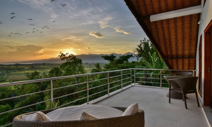 The unique property is set 30 meters above sea level on a small cliff directly in front of Umeanyar Beach. The huge villa (700 sq-metre living space) has 4 master and main bedrooms and an additional family bedroom. It is fully equipped with a large kitchen including all modern appliances, a spacious living and media room, a huge infinity pool, and various lounge areas, balconies and terraces to benefit from the vast and breath-taking scenery of this unique spot. The villa is surrounded by 3400sq. metres of terraced tropical gardens on three levels. There are two Bale Bengongs (Gazebos) built directly into the cliff with stunning views over the blue ocean and the vivid green rice paddies stretching right up to the edge of the black volcanic sand beach of the Bali Sea. An old majestic fig tree gives shade and lends the villa its name. The centre of the L-shaped house with its large infinity pool opens to the green zone of the village. Being without direct neighbours, the property is an ideal location for ultimate privacy and relaxation experience. Yet, it is still very close to a variety of local & international restaurants and the smaller resorts of the area.