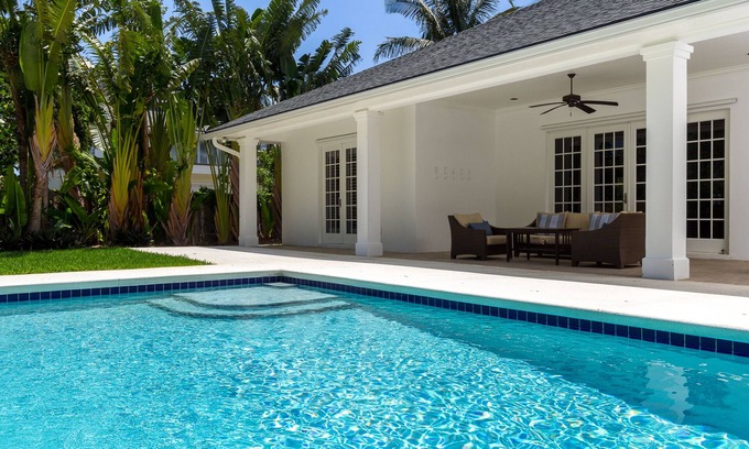 Luxury 4-bedroom designer villa with private heated pool - 100 yards from a private beach. (the house is the 3rd back from the beach.) The house is beautifully furnished and sleeps 10. The 2 wing layout is ideal for 2 families as each wing features 2 King bedrooms and a bathroom. The modern, designer kitchen and large comfortable living room are in the center of the house, separating the 2 wings and both open on to the very private veranda and heated pool. High speed broadband (600 MBPS )WiFi throughout the house makes it great for working remotely.