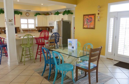 This beautifully renovated home boasts five spacious bedrooms, including four luxurious king suites and a delightful bunk room perfect for children. Gather in the expansive Great Room featuring plush seating and a large flat-screen Smart TV for post-wedding relaxation. The gourmet kitchen is fully equipped with two refrigerators, an ice machine, and all culinary essentials, making it easy to prepare delicious meals for you and your loved ones. Enjoy al fresco dining at a teak table on the deck, or fire up the gas griddle for a fun cookout. With two community swimming pools, tennis courts, and numerous amenities, your guests will have everything they need right at their fingertips.