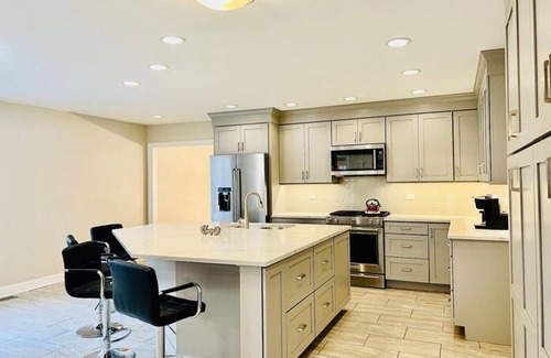 Welcome to our luxurious 5-bedroom, 3.5-bath oasis, accommodating up to 12 guests! Just 27 minutes from the airport and 35 minutes to downtown Chicago, this spacious retreat offers the perfect blend of convenience and comfort. Ideal for families and professionals alike, indulge in ample space, upscale amenities, and proximity to local attractions. Unwind in style, knowing every detail is tailored to ensure an unforgettable stay!