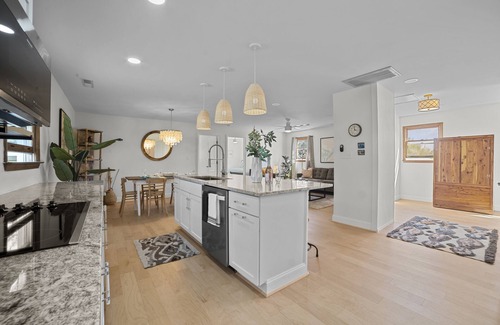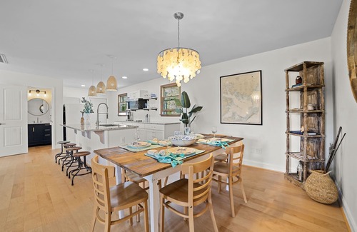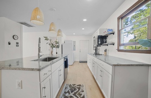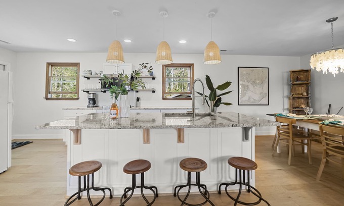 Our freshly remolded suites feature a unique combination of boutique design and coastal living. This desired UPSTAIRS unit is a two-bedroom Suite that sleeps 6. Brand NEW Queen bed and 2-brand NEW double beds. A gourmet kitchen with new appliance, granite countertop bar to entertain your family and guests. Marble vanity and Glass shower, stackable washer/dryer, newly installed air purifying system. Plenty of boat parking and just blocks from Orientals boat ramp. Park and enjoy a bike ride in the Village with our onsite bikes or take kayak out.