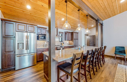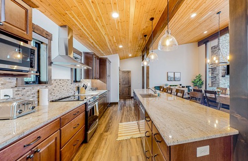Inside discover the heart of the home - the sun-lit living room. Centered around a beautiful stone fireplace, you will find ample, soft seating. The adjacent galley-style kitchen is a dream with its suite of stainless steel appliances, gleaming countertops, and large breakfast bar. Dining family-style will come naturally at the sprawling, wooden dining table, or even alfresco on the 1000 sq ft deck.