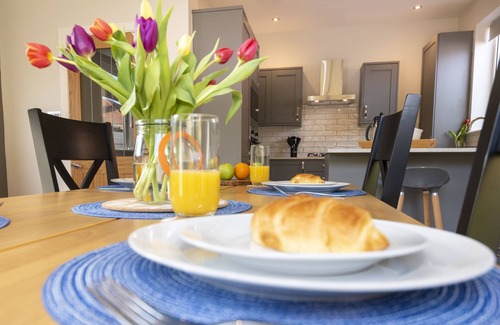 The house boasts a living room with log burner as well as a large kitchen and dining area to socialise and dine in.