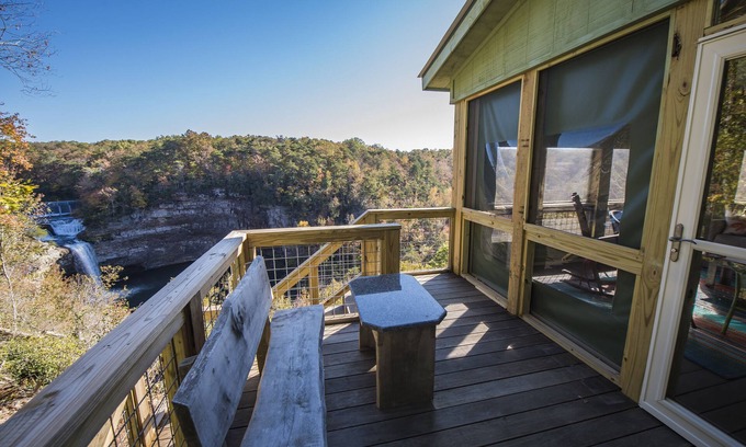 At Cliff House enjoy a three season screened porch facing Desoto Falls and a breathtaking view into the canyon basin and the Little River 120 feet below.