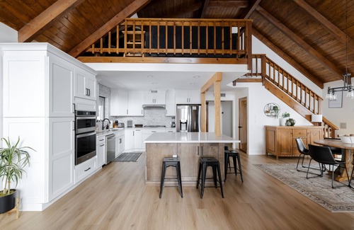 The spacious open great room is designed for comfort and relaxation, with plush sofas and chairs that will make you feel at home. The dual-side fireplace adds to the cozy atmosphere, and the pull-out sofa is perfect for snuggling up with your loved ones. The luxury vinyl plank flooring and wood-burning stove provide the perfect ambiance for colder nights, and the full view wall with windows offers stunning mountain views that will take your breath away.