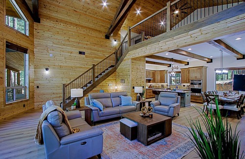 Luxury cabin offers the perfect getaway for couples or families. This 4 bedrooms has a CA king bed in master bedroom, Queen size bed in bedroom 2, two full beds in bedroom 3 and King bed and bunks beds in bedroom 4 (loft). Three smart TV's are in great room, master and loft. From the front door you enter into a large open floor plan consisting of dining, kitchen, great room with 24 ft ceilings. Large windows bring great natural lighting.