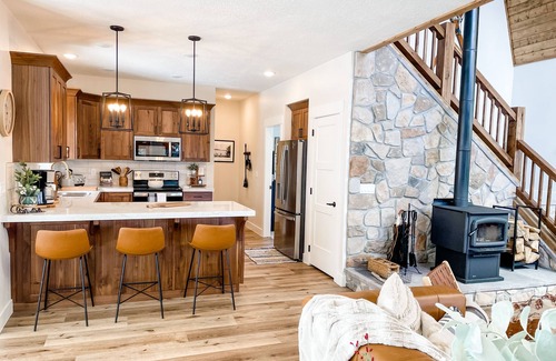 Welcome to our stunning 2021-built modern cabin! With an open-concept living and dining area that seamlessly flows into the large, well-stocked kitchen. Gather around the woodturning fireplace in the living room, or stroll out onto the deck from the living or dining rooms, which extend the full length of the home.
