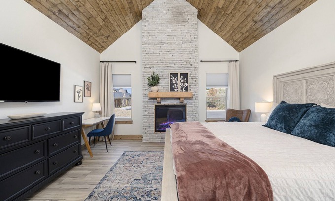 ✔ Unwind in this serene king suite featuring soft linens, cozy textures, and peaceful lighting—perfect for a restful night's sleep.