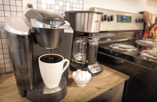 Kitchen has all the essential amenities including a stove, dishwasher, refrigerator, microwave, blender, kettle and Keurig machine with coffee and tea provided.☕🫖