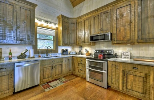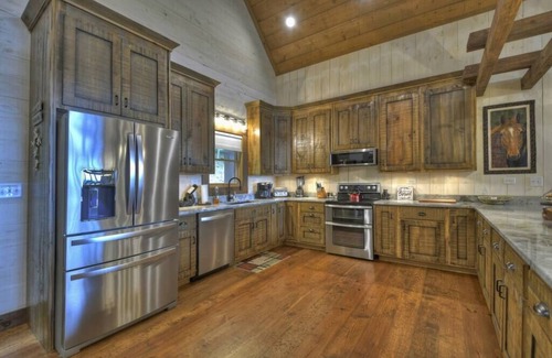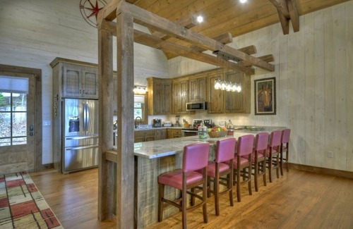 The dining room table seats 8 with 6 additional seats at the breakfast bar. The kitchen is fully equipped with granite countertops, stainless steel, wine glasses, cleaning supplies, a Keurig/12cup coffee brew pot, toaster, blender, knife set, crockpot, mixer, kettle, bbq tools, waffle maker, dishes, mixing utensils, measuring utensils, grater, mixing bowls, baking sheets, muffin pan, pots and pans, cutting board, pizza cutter, can opener, wine opener, and silverware. There is a gas grill attached to the cabins main gas line on the porch.