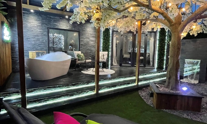The outside space all centres around the magnificent blossom tree. On the decked area you can relax in the whirlpool bath tub. Enjoy toasting marshmallows on the fire pit.