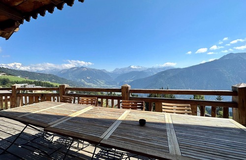 Exceptional, aerial south terrace, offering panoramic views of Mont Blanc and the Beaufortain mountains.