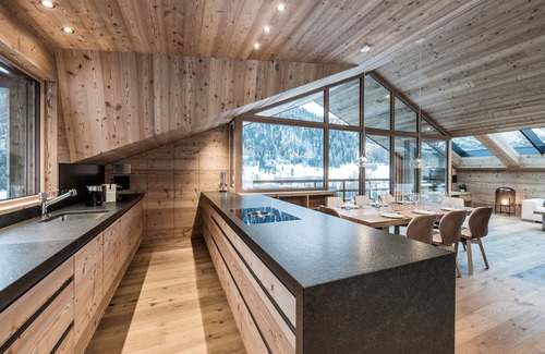 The light-flooded chalet has three luxuriously furnished double bedrooms, three bathrooms (two directly at the bedrooms), a spacious kitchen (about 70 m²) equipped with the latest technology, a large dining table, fireplace, cozy couch area with TV and a high-end surround system. The entire chalet has Wi-Fi.