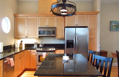 The two bedrooms are located downstairs, along with two bathrooms and full laundering facilities. The master bedroom has a king bed, armoire with high definition smart TV, an attached bathroom with two-sink granite countertop, and tiled shower enclosure and tub. The second bedroom has a queen bed and an adjacent full bathroom with granite countertop, and tile and glass shower enclosure.