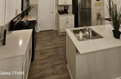 Welcome to our stunning 2-bedroom, 2-bathroom new construction condo in Canton, Michigan. This modern single-level unit comfortably accommodates up to six guests with a queen-size bed in the master bedroom and a pullout leather sofa sleeper in the living room and twin size beds in the secondary bedroom. The master bathroom features Jack and Jill sinks, and there is an additional bathroom for convenience. Enjoy the on-site laundry room for hassle-free cleaning. Located in a beautiful suburb, the condo offers a peaceful atmosphere while being close to downtown Detroit (35 minutes), Ann Arbor (25 minutes), and Detroit Metropolitan Airport (20 minutes). Experience the best of both worlds in our well-appointed Canton condo.