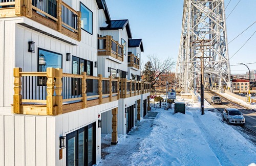 Your Park Point vacation starts at Dragestil! This new construction 2nd floor Scandinavian condo is sleek, stylish, and loaded with extras. The best part of staying here is being close to everything! You can walk to the beach, the lift bridge, all of the shops and restaurants in Canal, or just soak up a front row seat to the iconic lift bridge that makes Duluth special. You'll love entertaining your family and friends in this open concept space. Gather around the beautiful live edge island, get cozy on the living room sectional, or feel the sea breeze while enjoying your morning coffee on the lakefront patio. This condo has two king size beds, a full sleeper sofa, laundry, a well appointed kitchen and two spacious bathrooms you'll love getting ready in. If relaxing sounds good, take a soak in the jacuzzi tub big enough for two! Whether you're sipping your morning coffee, watching the sunset, or exploring nearby hotspots, this space has it all.