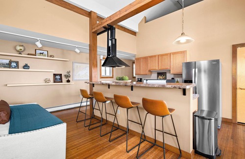 Your Park Point vacation starts at Dragestil! Named for the architectural style of the home, Dragestil ("Dragon Style") is a style of design and architecture that originated in Norway featuring decoration in the form of dragon heads with steep roofs and big eaves. You will be hard pressed to find a more unique location in Duluth. This 1st floor Scandinavian condo is sleek, stylish, and loaded with extras. The best part of staying here is being close to everything! You can walk to the beach, the lift bridge, all of the shops and restaurants in Canal, or just soak up a front row seat to the iconic lift bridge that makes Duluth special. You'll love entertaining your family and friends in this open concept space. Gather around the beautiful kitchen island, get cozy on the living room sectional, or feel the sea breeze while enjoying your morning coffee on the deck. This condo has a loft style bedroom with a king size bed, a queen day bed, a well appointed kitchen and a spacious handicap accessible bathroom you'll love getting ready in. Whether you're sipping your morning coffee, watching the sunset, or exploring nearby hotspots, this space has it all.