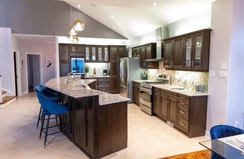 Escape to serenity upon entering the lower level where you will find a Jacuzzi hot tub, a bar, and an indoor activity center. For entertainment, the home is equipped with a T.V on each floor with access to Netflix. The kitchen is fully equipped with utensils and appliances to meet all your daily kitchen needs.
