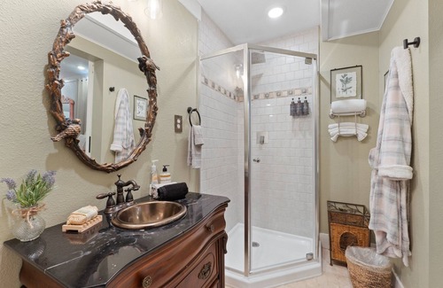 The bathroom is a sanctuary of its own, with a stand-up shower featuring a rainhead faucet, luxurious towels, and a soft bathrobe. Shampoo, conditioner, and soap are provided for your convenience, and plenty of luxuriously soft towels to dry off on.
