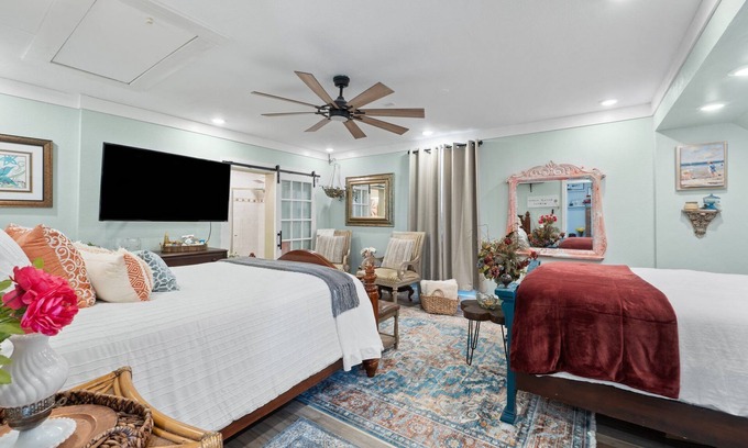Welcome to Camelot’s Serenity Suite, a spacious private retreat with two queen beds and a private entrance. This is a completely separate Suite from the main residence with its own exterior entrance. It is not accessed by the main house. Relax by the fire pit, enjoy the waterfall and pond, or unwind in the indoor pool and outdoor hot tub. Start your day with a delicious homemade breakfast. Get creative in the on-site art studio (fees apply). Need more space? Other suites are available. With elegance, comfort, and nature all around, this serene escape is the perfect place to relax and recharge!
