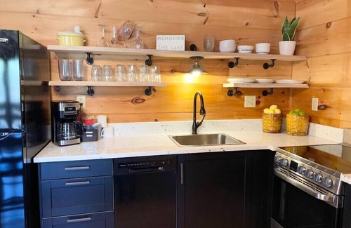 This well-appointed cabin features a master suite with a king-sized bed and en-suite jacuzzi bathroom, ensuring your comfort and relaxation. The large second bedroom boasts a custom queen bed and a view of the serene screened porch, perfect for sunrise moments. Kids will revel in their own cozy loft space, designed as a whimsical retreat, while you enjoy evenings by the stone gas-log fireplace in the living area. The expansive screened porch is the highlight, offering an enchanting outdoor space for dining, celebrating, and enjoying the stunning views. With a fully stocked kitchen, dining options extend to the outdoors, allowing for seamless entertaining on your wedding day.