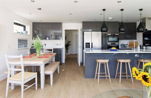 The fully-equipped kitchen and dining area boasts a minimalist-Scandinavian design with modern appliances and large breakfast bar with wooden stool seating.