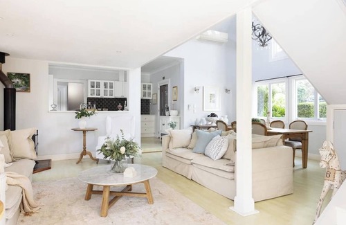 The Witta Chapel is the heart of the property, rich in history and beautifully restored. The open-plan living area spills out through bifold doors onto a spacious deck, where quality outdoor furnishings make alfresco dining or morning tea a true pleasure. A country-style kitchen fitted with premium Smeg appliances and a state-of-the-art coffee machine brings warmth and practicality to every meal.