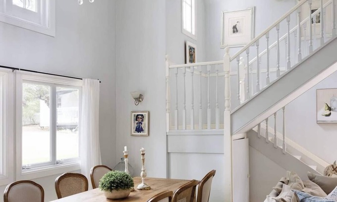 This residence features three unique bedrooms and two bathrooms. The master loft suite boasts a king bed with luxurious linens and a clawfoot bath in the private ensuite. Two additional loft bedrooms are located on the opposite side of the house, connected by a charming family room—ideal for children or relaxed movie nights. Stained-glass windows, exposed beams, and nostalgic architectural details enrich every space.