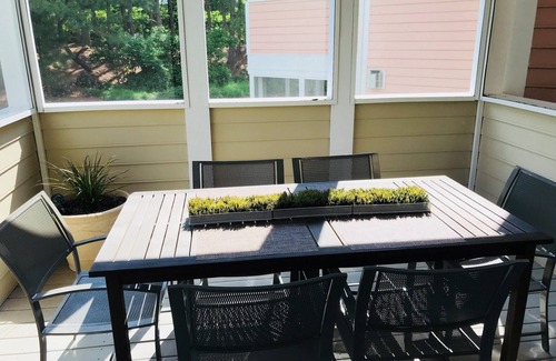 Take the stairs up to the 2 story/main level, which features an open concept living room and kitchen combination. The gourmet kitchen includes stainless steel appliances, quartz countertops, double wall ovens and all the needed appliances. Step out the French door onto the dining porch, where there are (6) chairs for al fresco dining. In the family room, there are (2) comfortable couches and a bench to seat 8 in front of the 50" flat screen TV mounted over the fireplace. Inside the front door on the main level is the formal living area and dining room combination with attached Butler's Pantry. The living/dining area opens out through (2) sets of French doors to the front deck. There is also a 1/2 bath on this level.