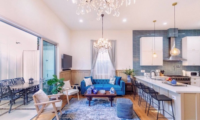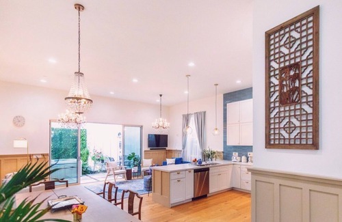 Located in the back loft house across the garden, the Jade House is a French country living space with a 12 foot high ceiling and skylight allows gorgeous sunlight into the living room. USB/USB-C outlets in multiple places for meeting/study/devices. A second dining/study/meeting space in the living room provides guests who need a smaller, more private setting.