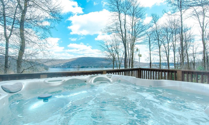 Nestled in the heart of the picturesque Deep Creek Lake area, Eagle's Nest stands as a quintessential mountain retreat, offering an enchanting escape for those seeking a perfect blend of luxury and natural beauty. This spacious home exudes modern elegance, featuring an open-concept design, cathedral ceilings, and large windows that showcase stunning lake views. The homey kitchen is perfect for creating homemade meals, while the stone fireplace and cozy furnishings create an inviting atmosphere in the living space. With a private outdoor hot tub, expansive dual-level deck, and fire pit, guests can unwind while soaking in the breathtaking surroundings. Whether challenging friends to games in the lower level recreation area, enjoying the sauna, or gathered around the fireplace for a movie night, every moment promises relaxation and entertainment. Positioned for year-round enjoyment, Eagle's Nest provides convenient access to outdoor adventures, from water sports on the lake, hiking the tails at the various state parks, to skiing in winter. Whether you seek adventure or serenity, this meticulously crafted retreat ensures a memorable escape in the lap of Deep Creek Lake's natural wonders. Book your stay today!