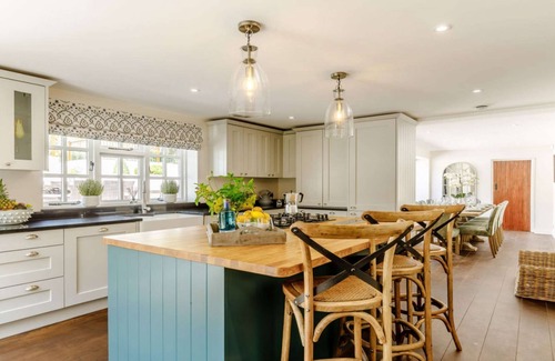 Bi-fold doors to the garden, central island with granite worktops and three bar stools, two ovens, gas hob, fridge, butler sink with waste disposal, wine fridge, microwave, dishwasher, kettle, toaster, cafetière and ten-seater dining table with chairs