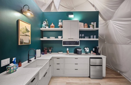 Our domes feature smart locks for seamless, flexible check-in, fully stocked kitchens with mini fridges, hot plates, quartz countertops, and large sinks, plus a cozy eating area. The king-sized memory foam mattress promises restful nights, with built-in drawers for storage and a selection of board games. Nightstands double as spacious wardrobes for your essentials, and at the push of a button, the footboard reveals a 50" smart TV for cozy evenings in, or hides away to showcase the panoramic Hill Country views, complete with curtains for privacy. Gaze at the stars through the openable massive skylight window above, inviting the magic of Hill Country nights.