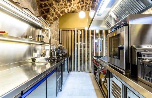 The entrance foyer, at the heart of the ground floor, serves as both a welcoming area and a lounge. To the right of the foyer, two double bedrooms with unique features are equipped with private bathrooms and direct garden access. Additionally, this area houses a laundry room with a washer and dryer. On the ground floor, you'll find a fully equipped professional kitchen, a cozy living room with a fireplace, and an impressive dining area dominated by a massive, one-piece table crafted from wood and stone, capable of seating 16 guests. A historic staircase from the entrance foyer leads to the first floor.