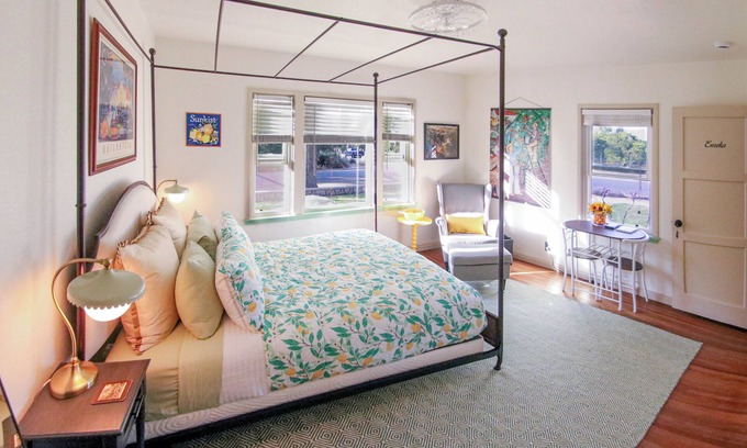 Experience mountain views over one of the last preserved orange groves in town, perfectly situated for the intoxicating aroma of blossom season during the spring for you to treat your rooms as your personal “sleeping porch.” This peaceful neighborhood was a filming location for Spielberg’s “The Making of an American Quilt!” A perfect walkable base camp for photo shoots at Prospect Park or for your event at Kimberly Crest, or for business or leisure travel.