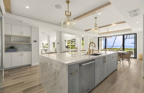 Step out to the enormous lanai to witness the tranquil seaside swimming pool and spa, decorated with chaise lounge chairs and beach umbrellas amidst the manicured tropical flora for relaxing and refreshing fun under the Hawaiian sun. Enjoy festive meals outside using the outdoor kitchen, grill & covered dining table set for 8, and stay out to marvel at the colors of the evening sunset until the stars come out across the Hawaiian night sky.