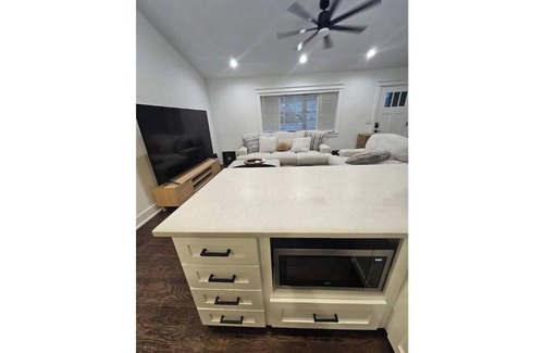 The living room has an ULTRA plush couch and oversized chair. As well as a MASSIVE 86" smart TV to catch the big game!