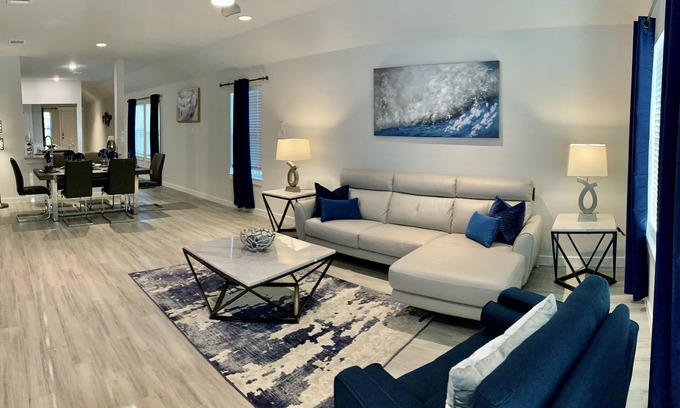 Beautiful New Construction LUXURY HOME backing up one of the community lakes and located in a gated section of one of the most desirable master plan communities in Texas City. This Contemporary Style Corporate Housing unit is move-in ready, fully furnished and fully equipped, showing as luxury model home. Feel like you are on vacation when you are home with a resort-style swimming pool, clubhouse, fitness center, covered pavilion with picnic tables, walking trails, etc.