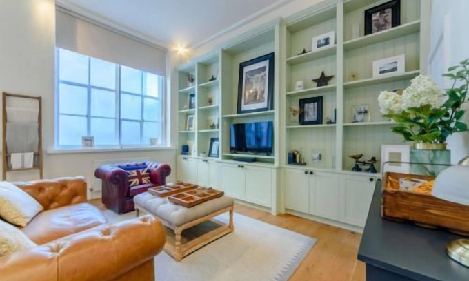 Cupboard off the living area contains a fabric armchair, chest with a selection of books and an ironing board