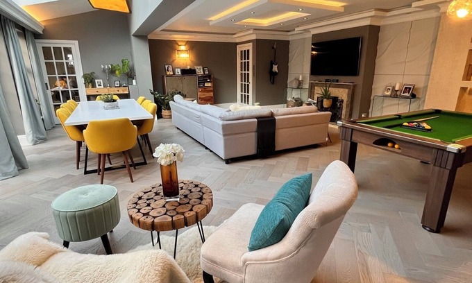 ***LAST MINUTE AVAILABILITY*** Welcome to our magnificent luxury family-friendly home nestled in Surrey. Enjoy large idyllic gardens with a BBQ patio, a pool table, and an open fireplace. Kids will love the outdoor play areas, swings, trampoline, and bikes available. You can even bring your furry friend, subject to agreement with the owner. A cot is also available.