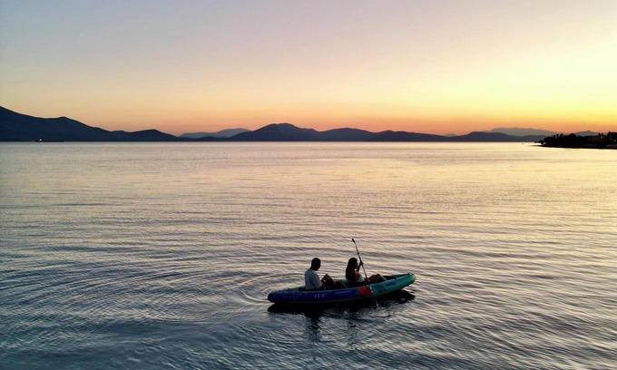 Outdoors, you can unwind in shaded seating areas with comfortable sun loungers and umbrellas. Enjoy endless summer fun with complimentary kayaks and SUP boards, or simply relax by the infinity pool and soak in the Mediterranean atmosphere.