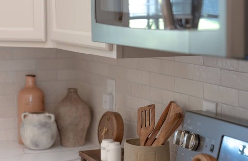 3 Smart TVs with streaming access. Fully equipped kitchen with modern appliances, coffee essentials, and generously stocked cookware, bakeware, and serving essentials.