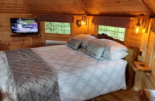 Hobbit Lodge is quite unique in it shape and layout, keeping a theme of being rustic, cosy and enchanting. It has a rustic homemade king size bed, comfy sofa and TV. A small well equipped kitchen area, gas cooker, fridge with freezer compartment, sink and plenty of cupboard space. There is heating and a small bio ethanol wood burning stove which gives a very real effect of a woodburner for those cooler nights.