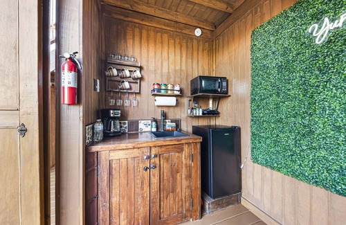 Our kitchenette, located on the same deck as the yurt includes a mini fridge, electric stove, microwave, coffee pot, kitchen utensils, pots, pans and essential condiments.