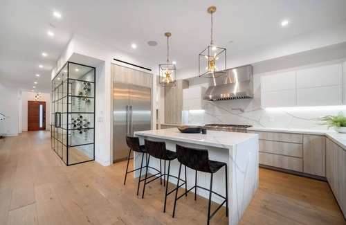 This stylish placThis newly constructed, modern home is set behind private gates, w/immaculate interiors & exceptional multi-purpose entertainment areas. Featuring 6 spacious beds/6.5 luxuriously-appointed baths as well as, warm Oak flooring & custom textural elements (stone, glass, marble, porcelain, iron) throughout - the home is the definition of refined living w/seamless indoor-outdoor flow.